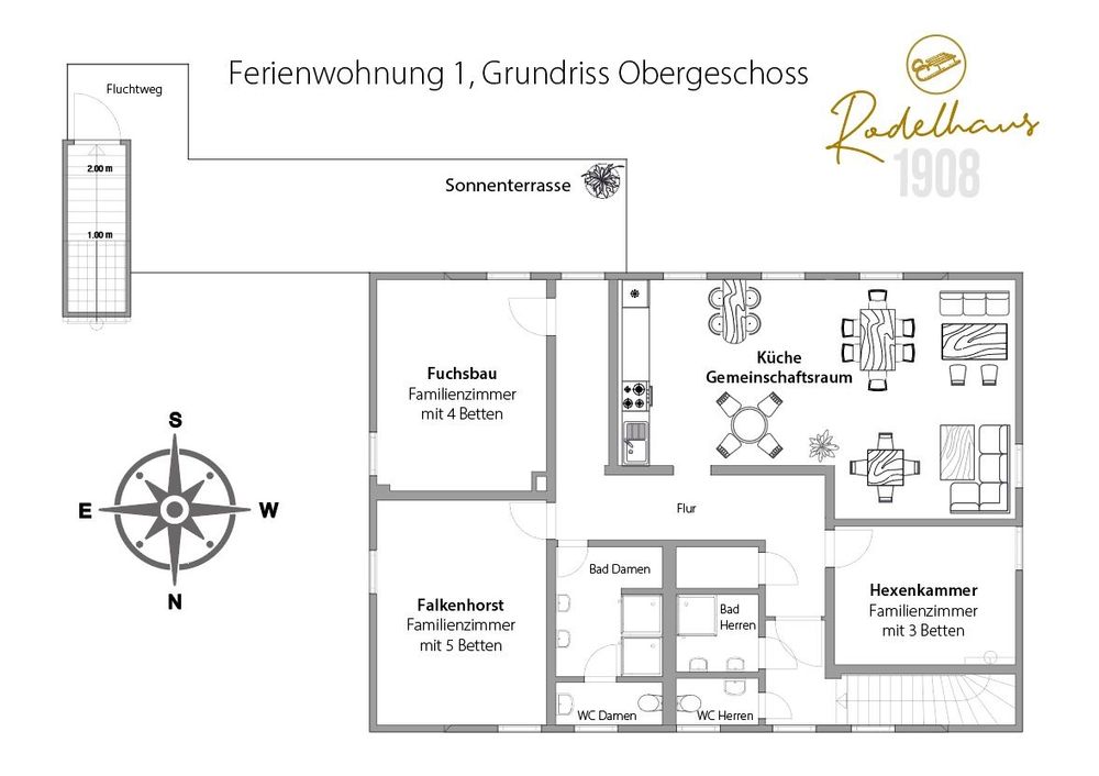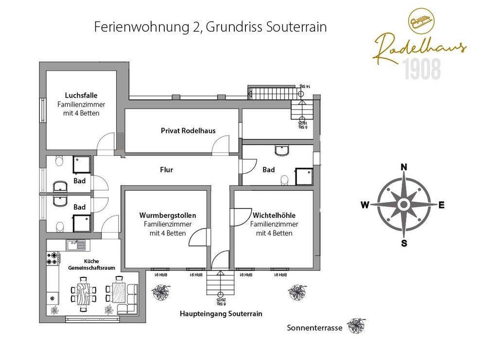 Die Küchen haben Vollausstattung und jeweils genügend Sitzplätze für alle Gäste. Die Bäder befinden sich auf dem Flur. Brauchen Sie einen professionellen Gruppen-Grillplatz, dann buchen Sie diesen bitte unter "Optionale Leistungen". Eigenständiges Grillen ist nur so professionell und sicher möglich. Details und Bilder finden Sie auf dieser Homepage unter Erlebnisse.